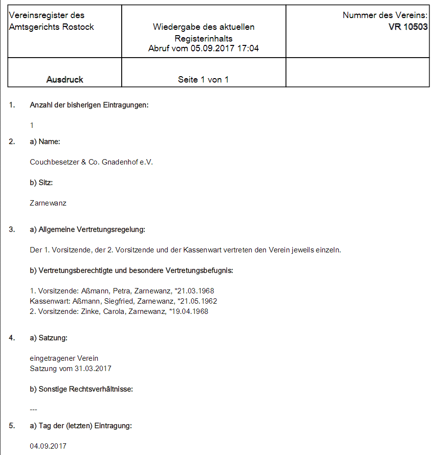 Die Satzung wurde in der Gründungsversammlung vom 31.03.2017 errichtet.